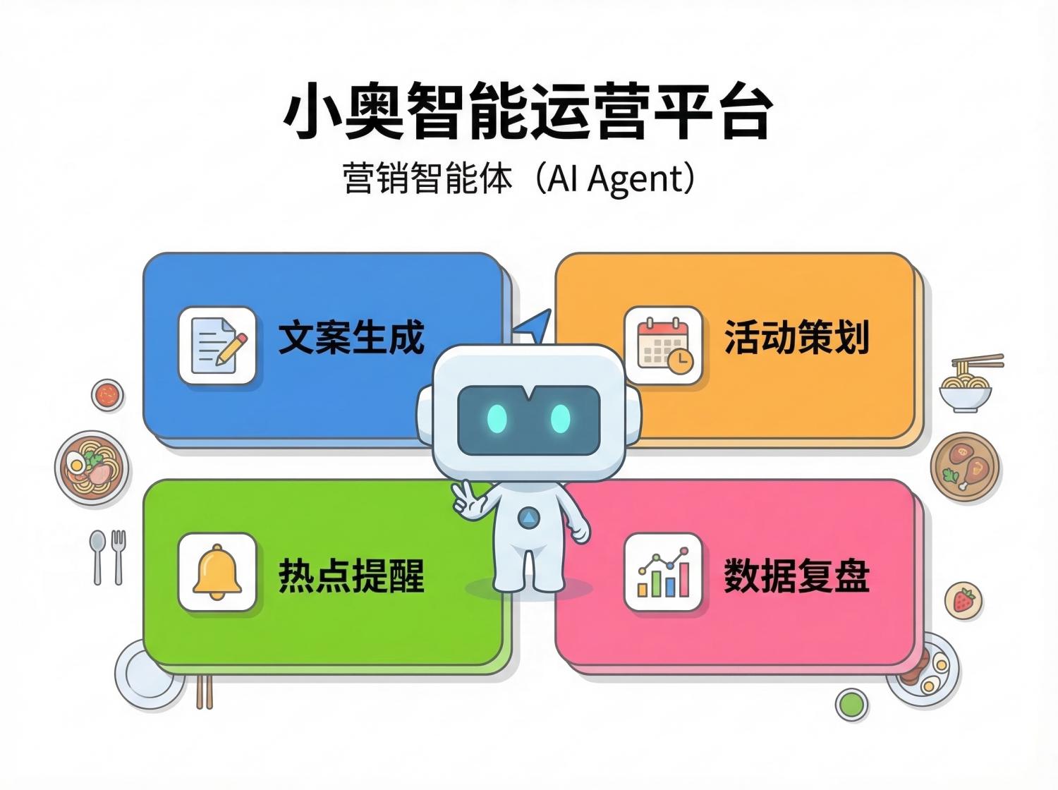 A:营销智能体(AI Agent)是小奥智能运营平台中的核心能力模块之一,面向餐饮营销场景,支持内容生成、活动策划辅助、热点响应与营销复盘。