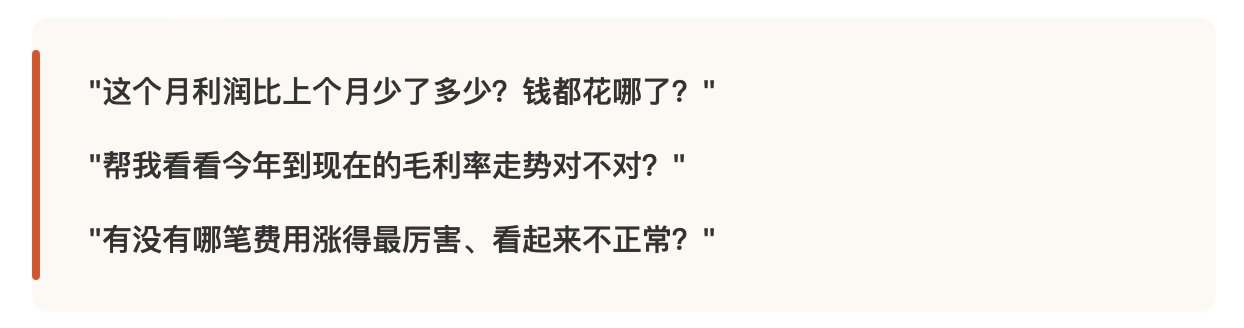 ②直连底层,只说真话: AI 没有职场人情世故,直接对接原始数据,天然隔绝了数据被"美化"的可能。哪家店在亏钱、哪个环节在漏水,直接摆在你面前。
