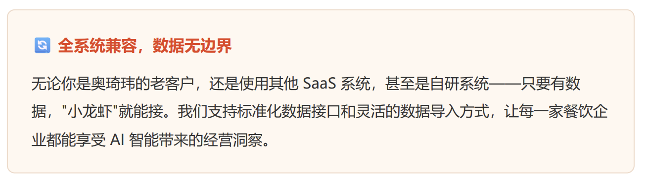 这只虾真正能下场干活的底气,在于我们注入的深度餐饮业务 Skill(技能模型)——沉淀了奥琦玮多年深耕餐饮行业的数据理解、业务分析和经营诊断能力。不管你目前用的是什么 IT 系统,它都能快速接入,激活你沉睡的业务数据。